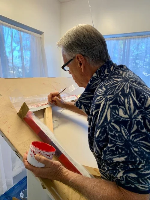 Stephen Robert Johns is a wonderful painter who covers a lot of territory in his work. In his life as well as in his paintings, he applies a strict discipline of excellence and a caring for his craft that is a joy to see in an artist today. Stephen's paintings are pristine, yet, unlike his idol Ellsworth Kelly, he has gone from painting minimalist geometric art, which he began while a student at Chouinard Art Institute, to painting reductive landscapes and natural settings.