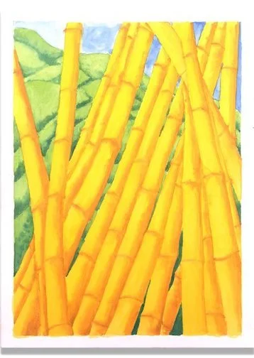 At the same time Johns reverts to the microcosmic with his equally abstracted (but still identifiable) renditions of leaves and flowers and other details of foliage. Once he lands on terra firma, he switches from geography or geology to biology, specifically (but not exclusively) botany. He trades the telescopic purview for the microscopic. But, given that his aerial views record patterns of forested or cultivated growth, Johns effectively paints the same thing from below as from above. The palm fronds and bamboo staves he renders over and over again, ringing variations on a kind of visual mantra of nature, comprise the ocean of chlorophyll that is the Central American jungle.